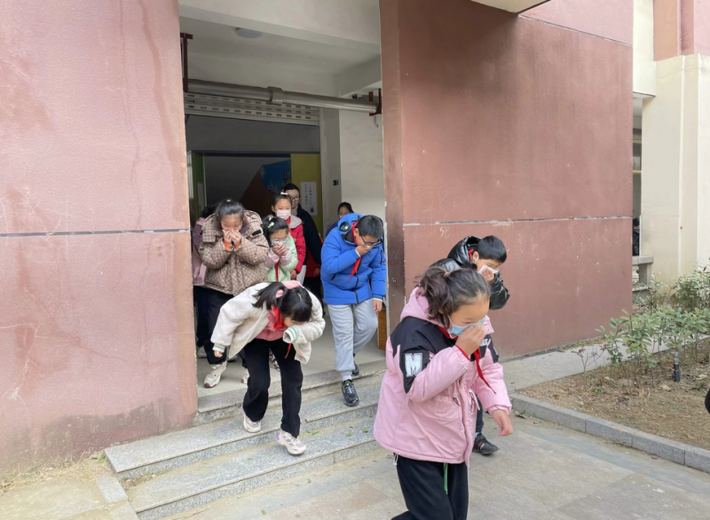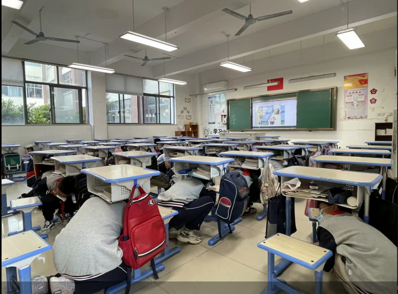 警报声响起,教师迅速组织学生优先选择课桌下方进行避险,蜷曲身体,双手抱头,书包或书本保护头部蹲在课桌下或墙角处,减少受伤的可能性,等待警报解除。