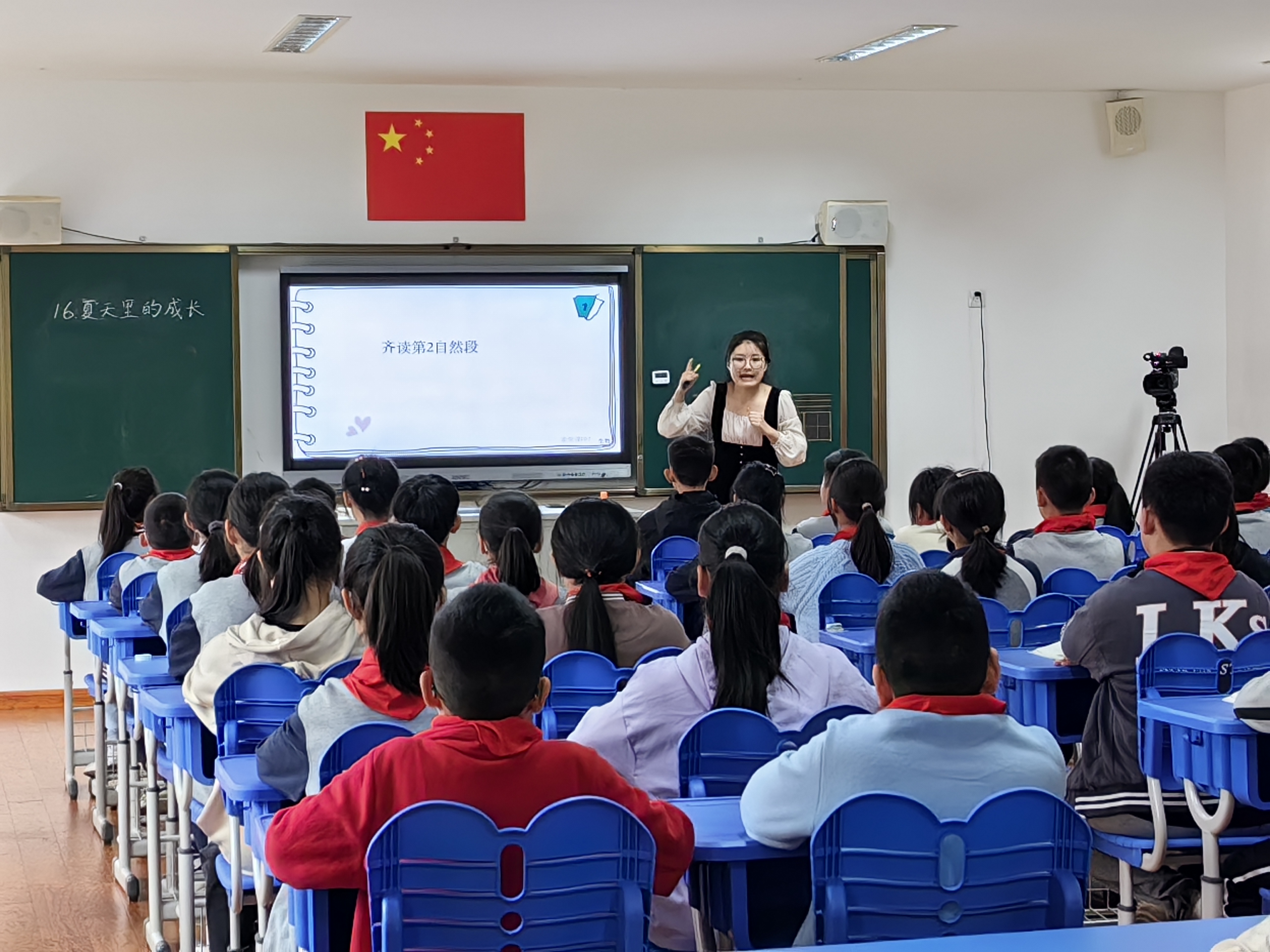 王露露老师带着六(15)班的同学一起学习《夏天里的成长》第二课时,同学们身临其境的感受到了夏天的万物生长。课堂上王老师及时表扬,及时鼓励,给孩子带来了极大的自信心。整齐响亮的口号、挺拔有力的坐姿,让各位老师感受到了同学们良好的精神面貌。