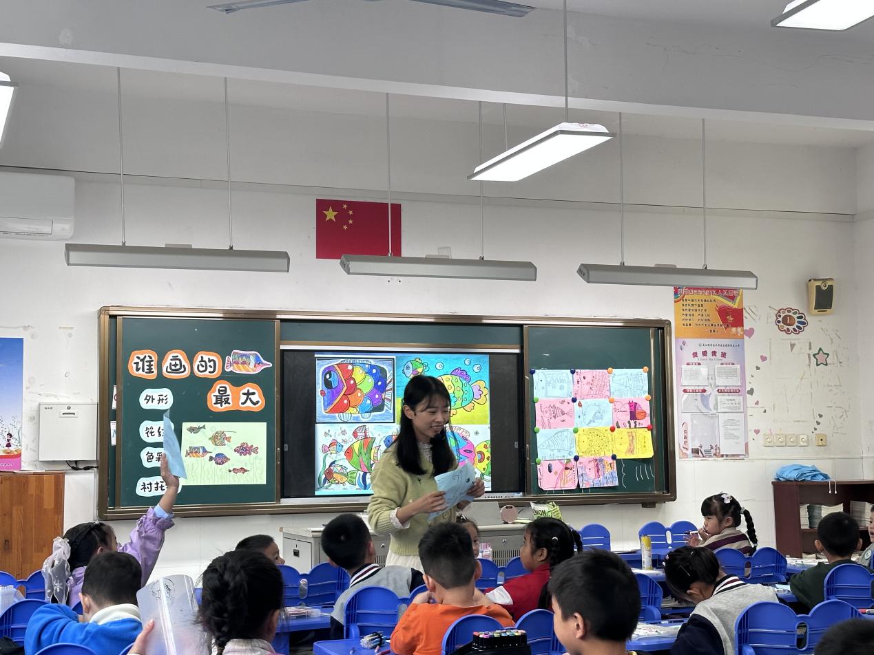 10月17日上午,在迎春校区一1班教室,宋娟老师执教了《谁画的鱼最大》一课。《谁画的鱼最大》是人美版小学美术一年级上册的内容,本课是属于“造型表现”学习领域的内容。本课的目的在于训练学生自由表现和大胆作画的基本能力,学习和掌握如何让画面饱满丰富的绘画方法。宋老师在导入环节让学生观看了一段视频,神秘的海底世界生活着各种各样不同的鱼类,一下子就激起了小朋友们的学习兴趣,让他们快速地投入到课堂中来。在教师示范的环节中,宋老师一步一步给学生讲解,并且根据学生说的内容来画出鱼的花纹以及周围的环境,示范作品生动有趣,帮助同学们打开了思维,在后续的学生艺术实践过程中创作了很多新奇有趣的大鱼,并且宋老师在学生作画的过程中也多次提醒学生一些作画要点,最后学生作品的效果也都很不错!