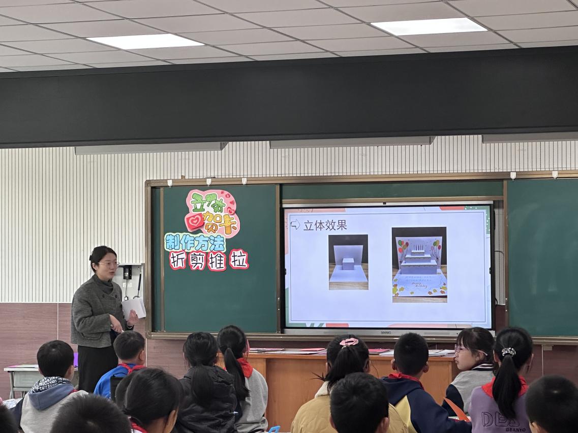 11月15日,倪爽老师执教《立体贺卡》一课。倪老师从剪、刻、折等不同步骤入手,带着学生进行操作,学生们通过小组合作,了解制作立体贺卡的材料特征,掌握立体贺卡制作的流程和方法。