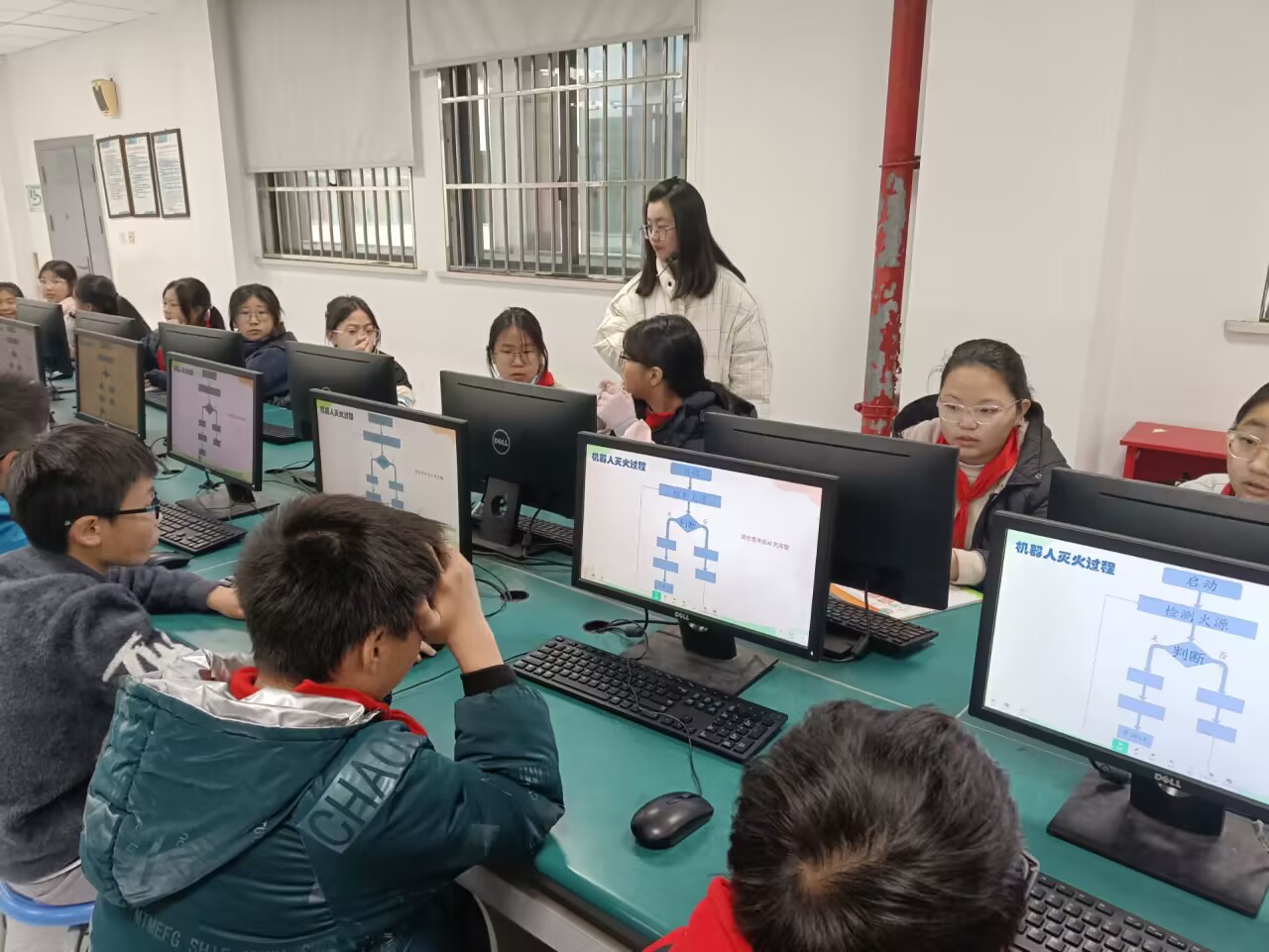 12月12日,施泽文老师开设一节六年级信息技术《灭火机器人》教研课。施老师为我们带来一节精彩的探究实践课《灭火机器人》,同学们通过观看消防员救火现场图片了解到火灾的严重性和消防员在火灾现场面临着巨大的危险,了解研制灭火机器人的重要性,如果有灭火机器人来协助消防员灭火,那么就会极大的提高灭火效率,减少消防人员的伤亡。本节课刁老师带领学生使用计算机在虚拟的环境下设计灭火机器人,通过模拟火灾环境,设计机器人搜寻火源并且成功灭火。本节课将机器人灭火的任务分成三个子任务:(1)找到火源(2)灭火(3)返回起点。以小组竞赛的方式组织教学,鼓励小组同学更快、更有效地完成灭火机器人设计任务。整个教学过程层层递进,学生锻炼了“自上而下、逐步细化”的编程思维,老师讲解详细,学生学习积极性非常高,课堂气氛活跃,各小组争先恐后地展示自己的设计成果。本节课学生既学会了设计灭火机器人的程序设计,为今后的编程学习奠定了基础,又了解到了生活中消防员的肩上的责任及危险性,增强消防意识的同时,深刻了解了消防战士的不易和艰辛。