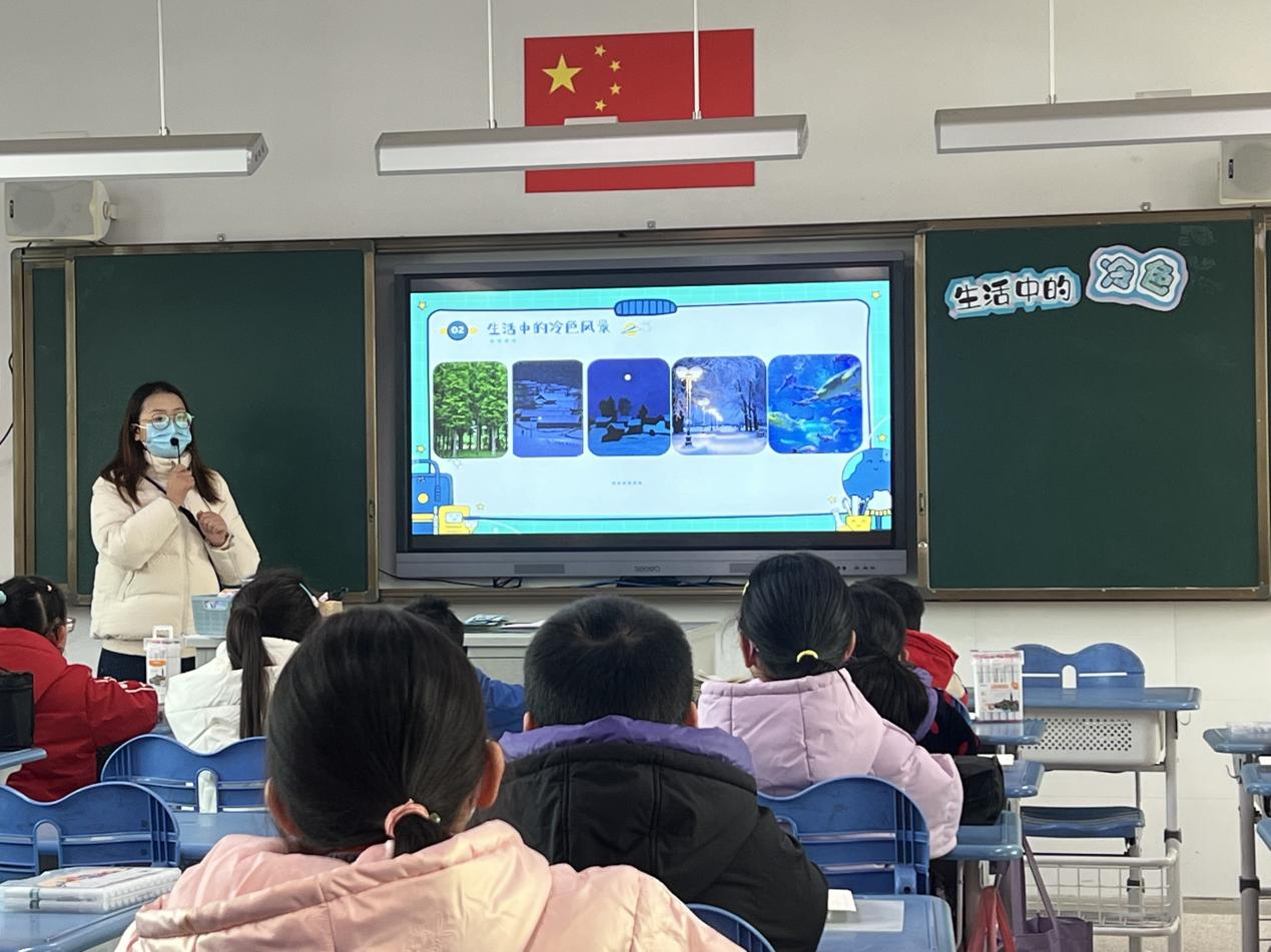 12月26日,上午第一节课,在明泉校区四13班的教室,听了舒萌萌老师执教的《生活中的冷色》一课。《生活中的冷色》是人美版四年级上册中“造型·表现”领域的内容,这一课是色彩基础知识课,旨在培养学生感受和认识色彩,能区分冷暖色调并感受冷色美感,提高学画色彩画的兴趣及表现技能。为了更好的调动学生的兴趣,舒老师准备了大量的冷色图片,充分利用图片、画家和学生的作品等素材。通过图片、作品比照,联系学生的实际生活中进行讲解举例,使学生了解色彩中冷色的相关知识,能说出生活中的冷色对自己的不同感受,会初步运用冷色表现生活,并鼓励学生能够善于发现并感受生活中的色彩美,培养审美、创造能力。