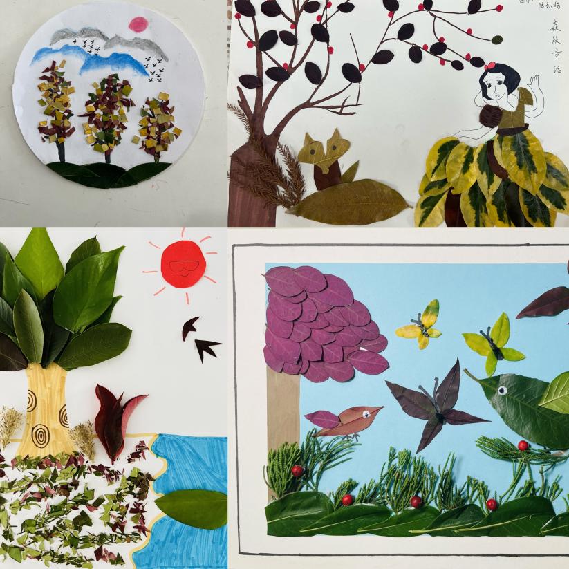 看,小树叶“变”出了很多不同的造型,使得画面非常有创意,一幅幅充满童趣又栩栩如生的作品。