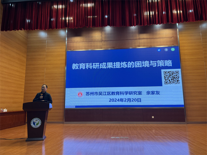 为进一步提升我校教师论文写作能力,提高教师队伍整体素质,并助力学校教育科研品质的提升与发展,我校于2月20日特邀原吴江区教育科学研究室主任余家友为全体教师举办了一场以“教学科研成果提炼的困境与对策”为主题的专项培训,唐菁菁副校长主持此次活动。