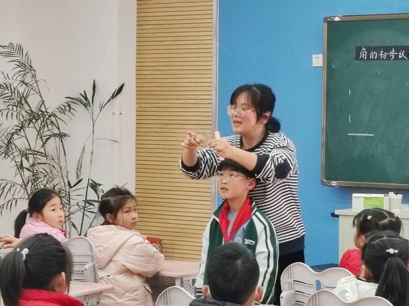 赵予老师执教二年级下册《认识角》一课她从一张图片切入,让学生发现其中的图形,从而引入本堂课要研究的"角".通过让学生感受角,了解角的特点,再让学生利用所学去创造角,从生活中的角再抽象到数学中的角。