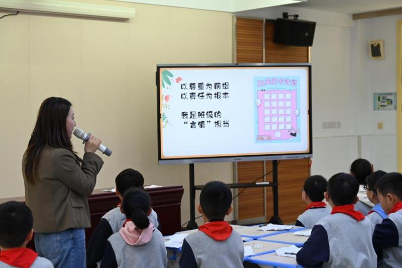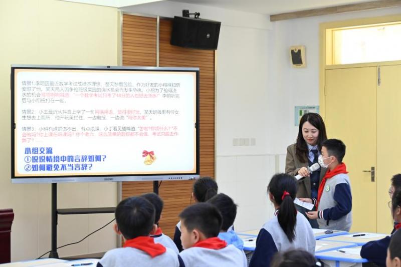活动伊始,我校班主任盛燕老师带来一节主题班会展示课《我是班级的“言值”担当》。盛老师从颜值和“言值”入手,引导学生明白美颜改变的是外在气质,而美言改变的是人的内在修养;接着通过情境短剧、“揉纸团”、写暖心话语卡等活动一步步引导学生懂得文明用语的重要性,争做班级的“言值”担当。