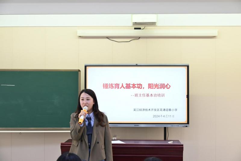 为进一步加强学校班主任队伍建设,夯实班主任基本功,不断提升班主任的师德修养、专业知识、育人能力和带班水平,推进班主任专业成长,提高学校德育工作的实效。4月11日下午,花港迎春小学开展了班主任培训活动。本次培训由学生成长中心主任张小玲主持,特邀苏州市德育学科带头人、苏州市名教师、苏州市骨干林老师、苏州市家庭教育高级指导师、吴江区中小学家庭教育指导与服务中心负责人施兰红老师与会指导,校长朱满喜,副校长胡霞萍、时娟以及全体班主任全程参与。