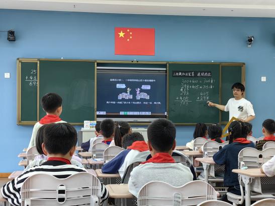 其次由姜天禹老师执教二年级下册《三位数的加法笔算(连续进位)》一课。