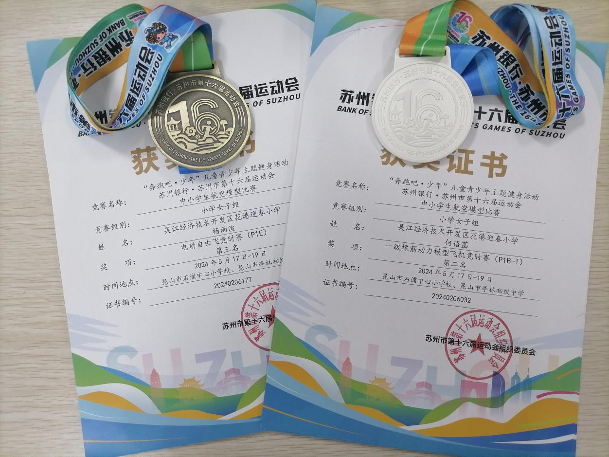 花小少年何宇菡获自由飞项目一级橡筋动力模型飞机竞时赛(P1B-1)第二名,获得银牌;杨雨渲获自由飞项目电动自由飞竞时赛(P1E)第三名,获得铜牌。