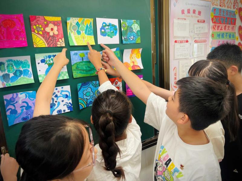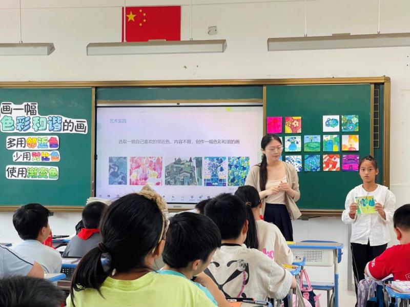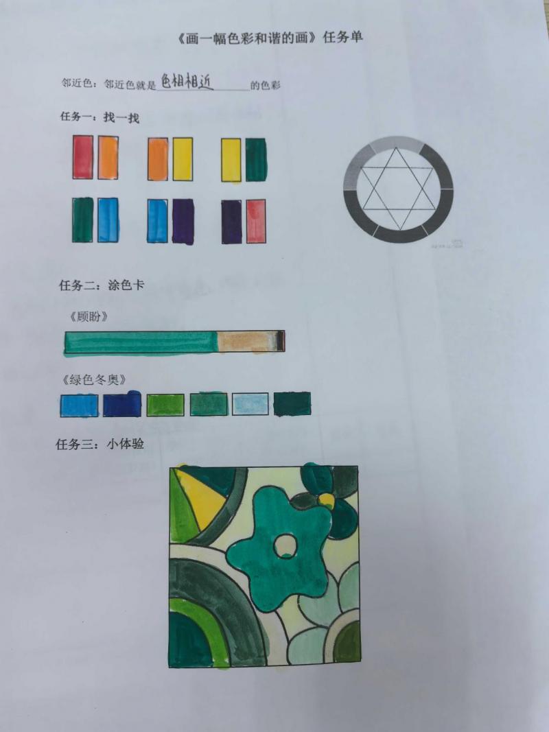 9月26日上午,花港美术组全体老师集中六8班教室,共同聆听倪爽老师的教研课《画一副色彩和谐的画》。本课是人美版小学美术六年级上册6课的内容,属于造型表现领域。倪爽老师以任务单的形式贯穿了整节课的重难点,任务单的难度层层递进。任务一:找一找,从色相环中找邻近色;任务二:涂色卡,从作品《顾盼》中分析并填图画面中邻近色与对比色的占比,从作品《绿色冬奥》中分析填图邻近色中蕴含的渐变色;任务三:小体验,让学生先进行小练笔,对本节课最终的实践环节做以铺垫。整堂课环节完整,层层递进,学生理论知识掌握的很棒!