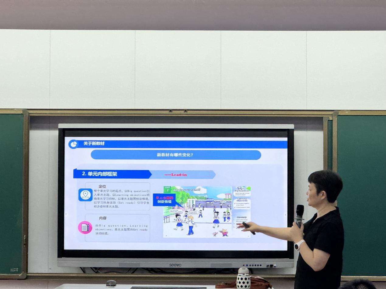 接着,凌云璇老师从修订思路、整体框架结构、单元内部架构、教材中体现英语学习活动观、教材特色以及落实新课堂等方面对新教材进行全面解读,使我校英语教师对新教材有了更深层的理解,大大提升了教师在实际教学中的课操作性,以学习理解、应用实践、迁移创新的英语学习活动观推进整个英语教学进程。