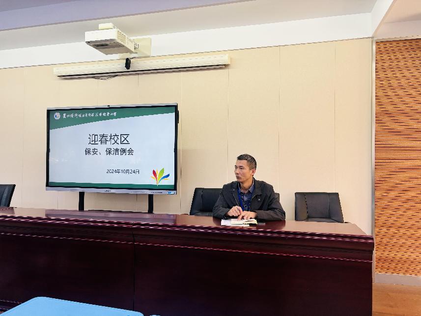 10月24日,根据学期工作计划,总务处组织迎春校区校园保安、保洁人员集中阶梯教室对开学以来的工作进行了回顾与反馈,总务处薛祥主任对于今后工作从校园出入人员管控、日常巡逻、岗位值勤、卫生常规和卫生死角的处理等方面提出了明确的要求和工作建议。