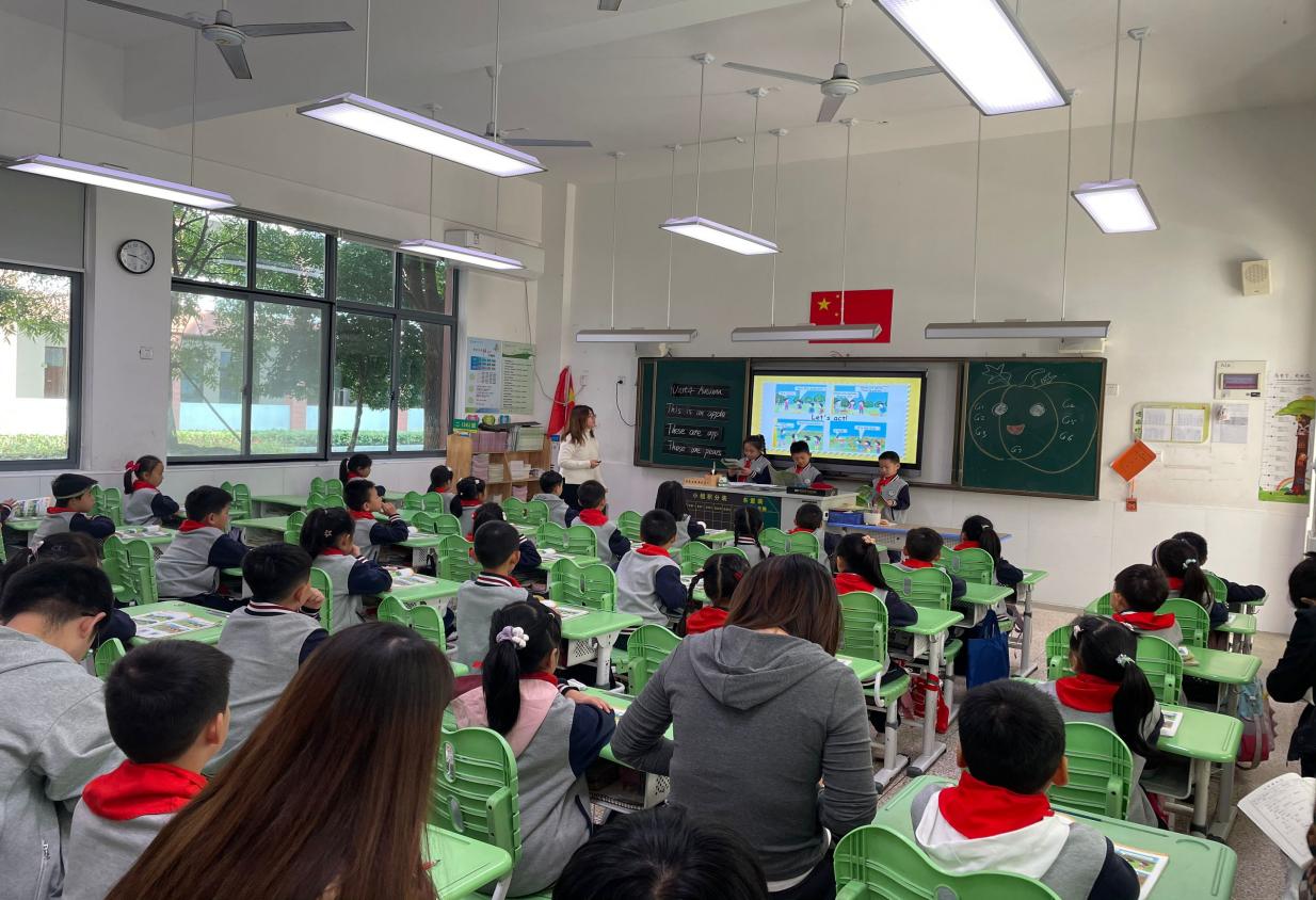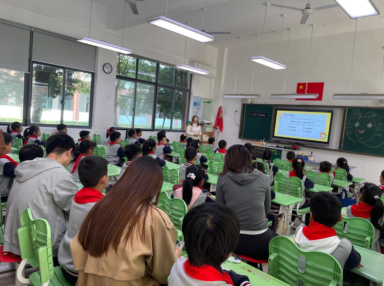 首先全体教师观摩叶佳梁老师的教研课。课程内容为2A Unit4 Autumn。此主题通过1、Enjoy a song. 2、Let's think. 3、Let's learn. 4、 Let's guess. 5、 Let's play. 6、 Brain storm. 7、Let's talk. 8、Watch and choose. 9、 Let's chant. 10、Let's act. 11、 Let's read.等环节呈现。