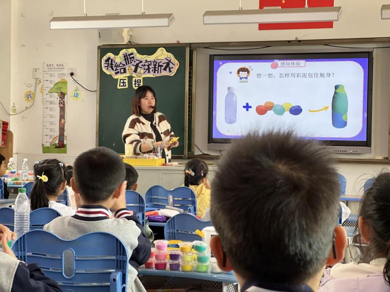 王珏琼老师执教的《我给瓶子穿新衣》这是一堂富有创意和实践性的美术手工活动课程,旨在通过动手操作为学生们提供一个发挥想象力、培养创造力的平台。王老师通过将废旧瓶子转化为生活中的艺术品,学生们不仅锻炼了自己的动手能力,也体会到变废为宝的乐趣。学生们在设计和制作过程中积极参与,作品充满了个性和创意。从实用笔筒到装饰性花瓶。每件作品都让人眼前一亮。王老师在讲解如何制作花瓶新衣的时候,分别讲解不同步骤所使用的不同方法。在范作欣赏时,进行植物类、动物类、人物类和奇思妙想等不同类型的作品图片欣赏,激发学生的创造欲望。王老师课程严谨自然,效果显著,引导学生巧妙运用色彩和形状,对简单形进行变形,作业完成度高。
