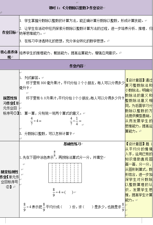 单元作业设计研讨简讯:苏教版六年级上册分数除法