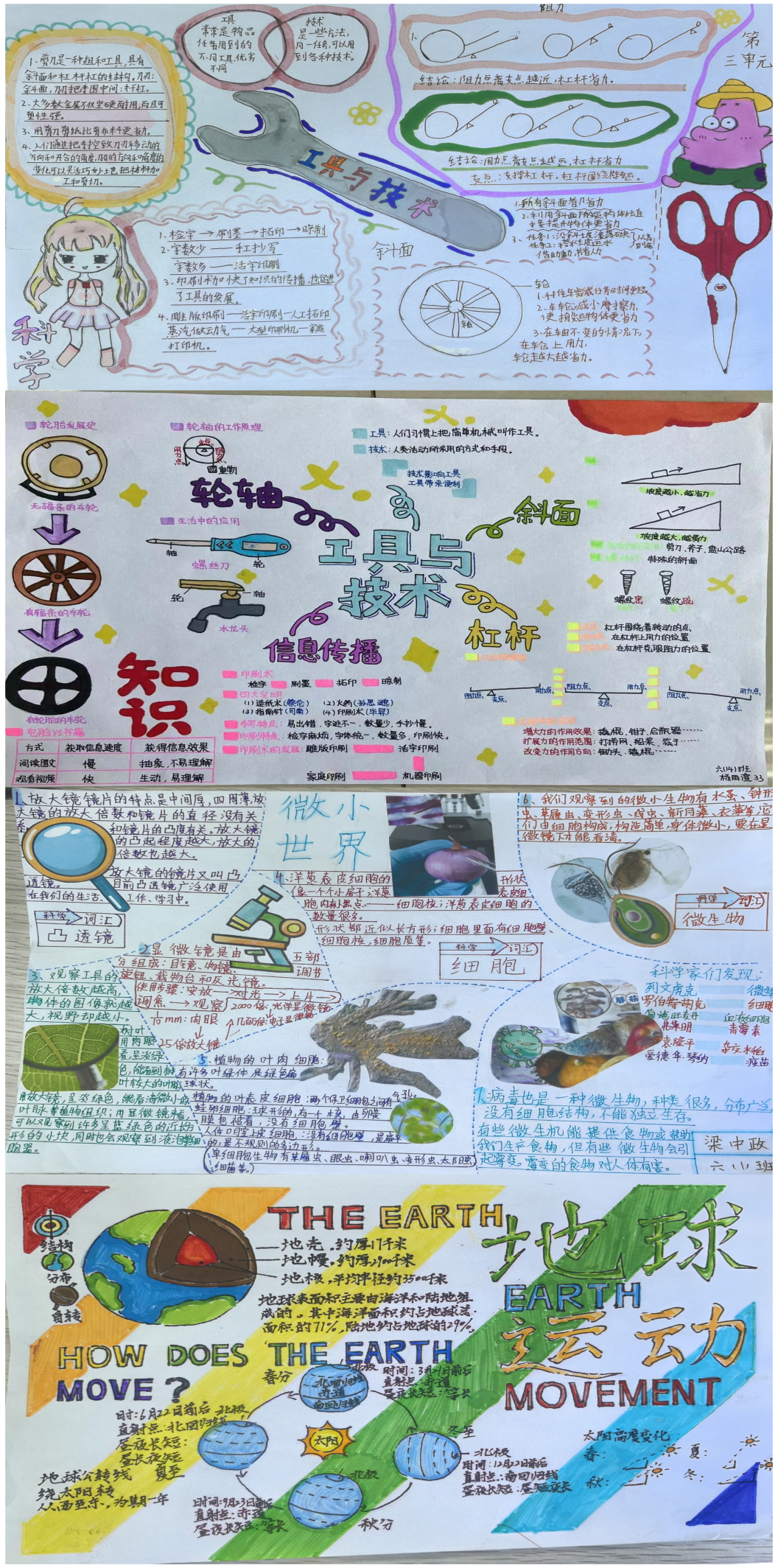 六年级同学则展开了丰富多彩的思维导图设计大赛,一个学期的内容在孩子们的手中融汇成一份集知识、艺术于一体的思维导图,让评委老师们赞不绝口。