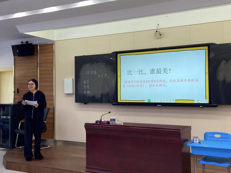 顾晓雯老师围绕文中“一只手上的五根手指,各有不同的姿态,各具不同的性格,各有所长,各有所短。”一句,引导学生自读课文,了解文章内容,五根手指各自的作用。