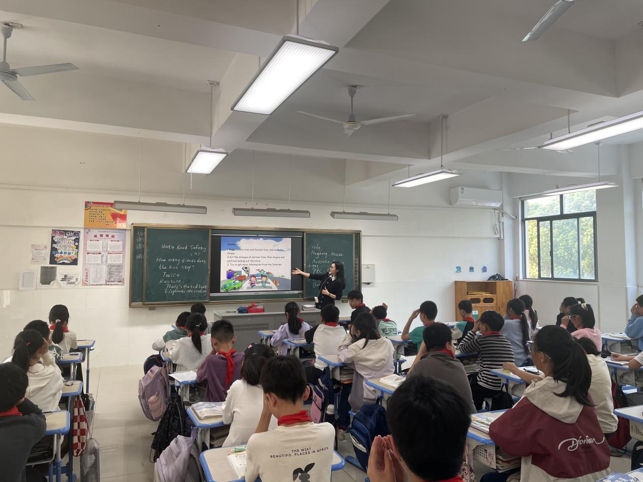 本节课是六下第四单元Road safety的第三课时。本节金老师利用图片、短视频等多媒体素材,构建了沉浸式的学习情境。激发了学生的学习兴趣和参与热情,让学生融入课堂,同时也使道路安全知识的学习更具现实意义。同时课上老师也对道路安全相关的英语词汇、短语和句型进行了梳理。从交通信号灯、交通标志的英文表达,到如何用英语描述安全过马路的步骤,层层递进,由浅入深。并且通过对比中英道路安全规则的差异,加深了学生对知识的理解和记忆,有效拓展了学生的文化视野。