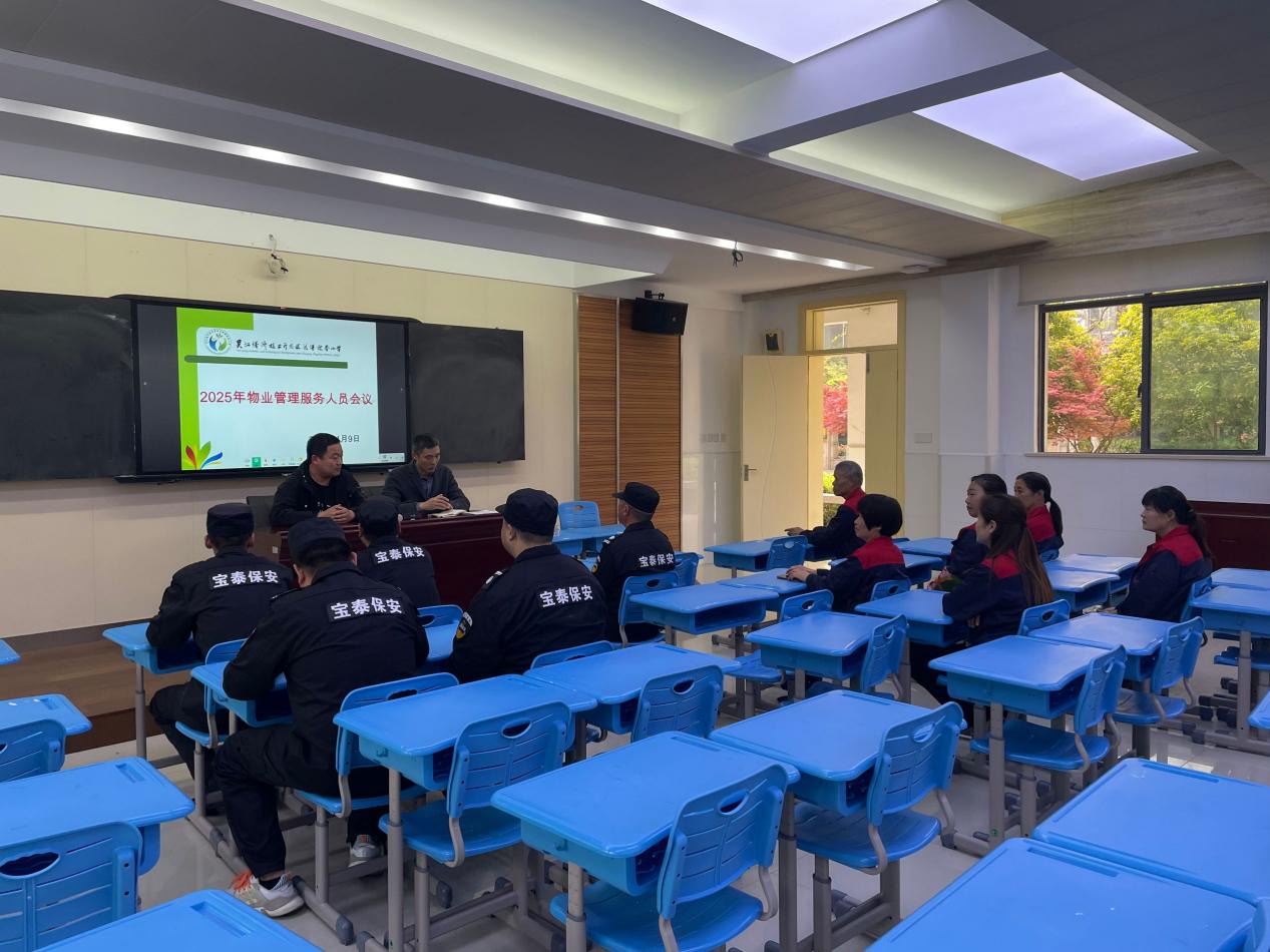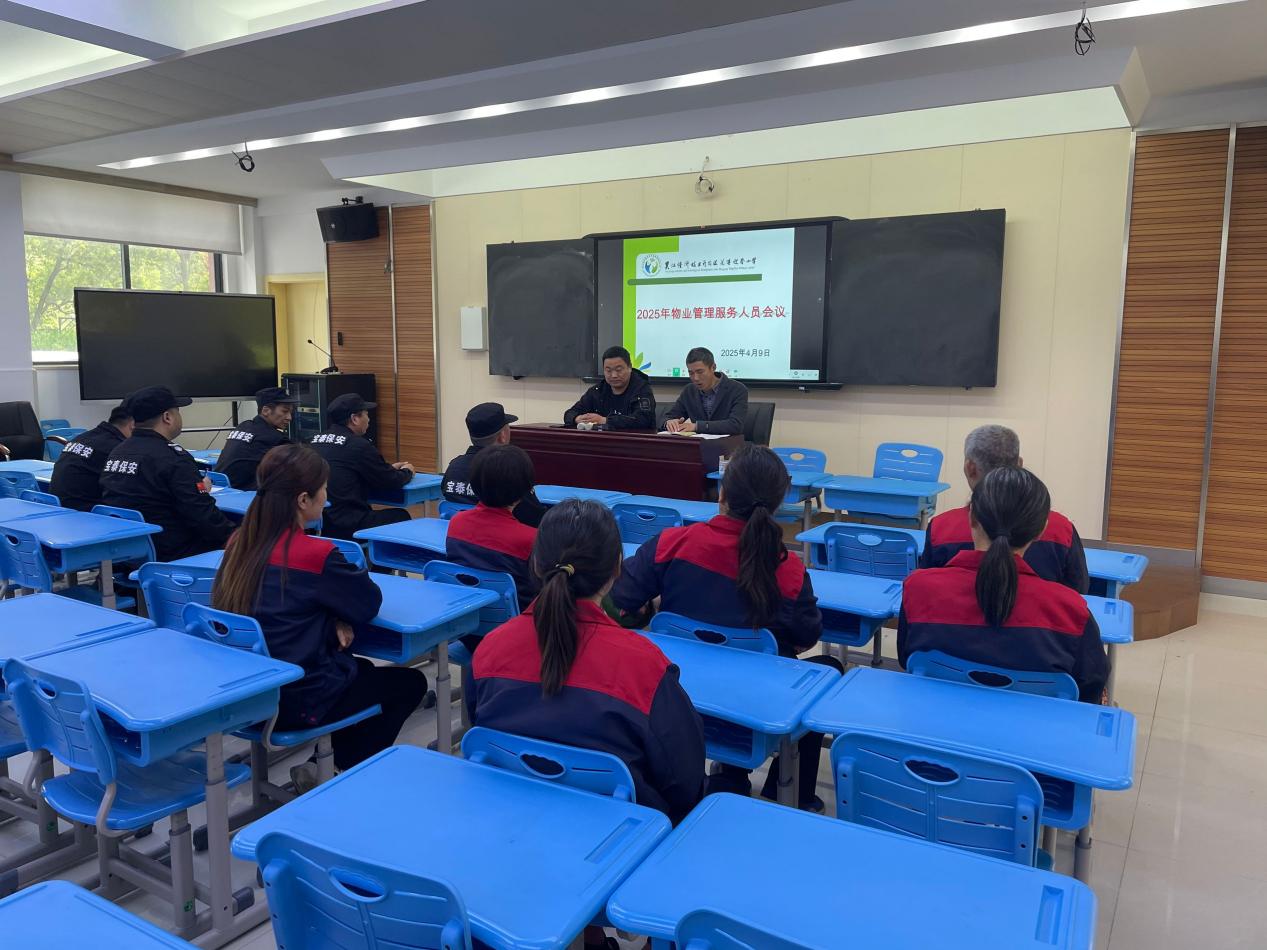 2025年校园物业管理服务经过前期的政府采购程序,新的服务供应方江苏宝泰保安服务有限公司已于近期完成入驻。为了更好的做好校园物业管理服务工作,总务后勤部门于4月9日组织了全体服务人员的岗位培训会议。