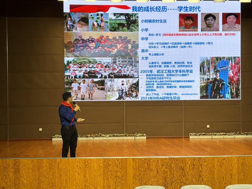 11月4日下午,中达电子(江苏)有限公司电控设计副经理、江苏省五一劳动奖章获得者尤文涛走进校园,为学生们带来了一场题为“践行劳模工匠精神、讲述成长故事”的专题讲座。 活动伊始,学生代表为尤文涛戴上了鲜艳的红领巾,表达了对这位劳模的崇高敬意。在同学们热切的目光中,尤文涛分享了他的成长故事和对于劳模工匠精神的深刻理解。