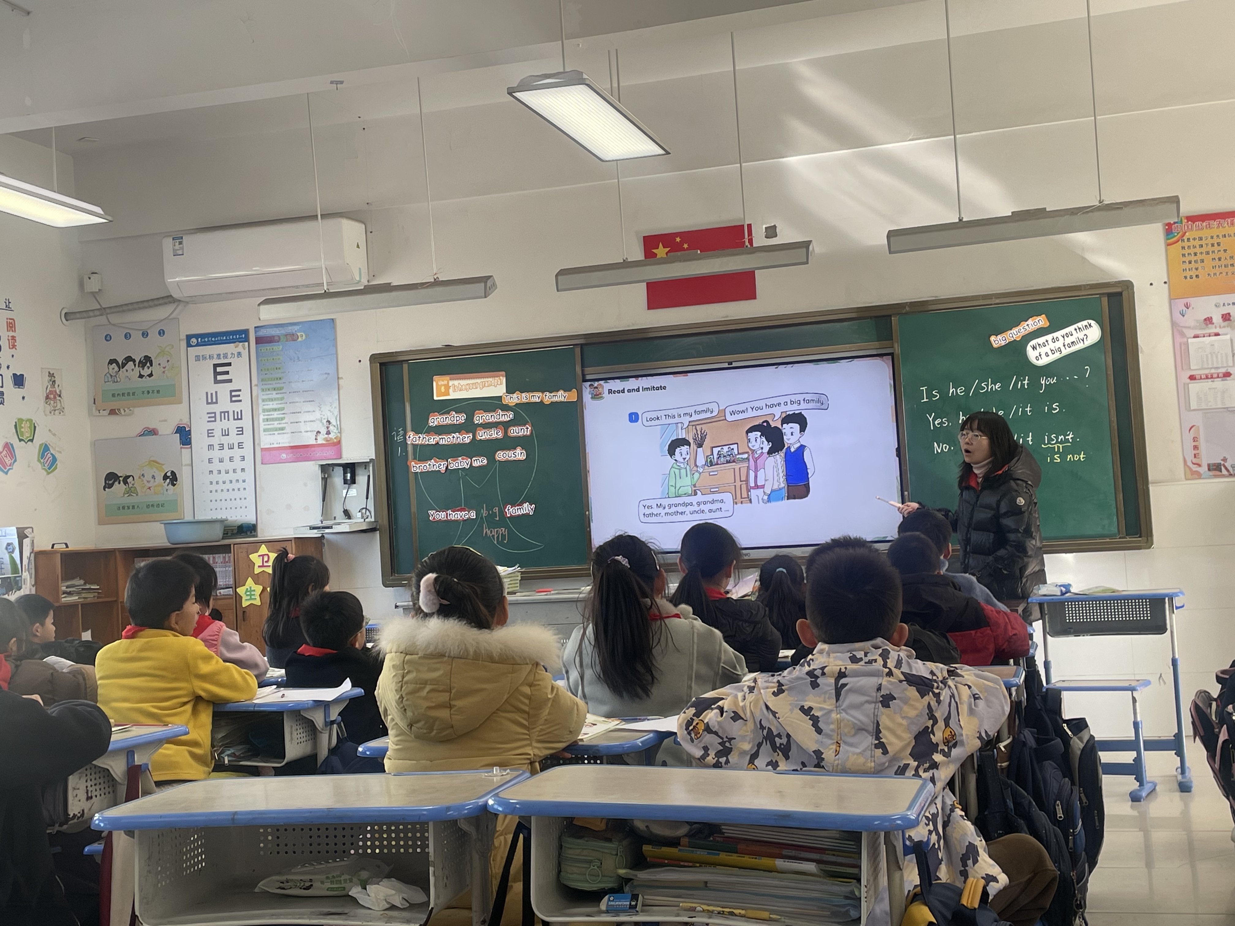分图精讲:王老师利用课文挂图,逐幅展开故事。通过提问(如:“Mike points to the man. What does he ask?” “Is he Li Shan’ grandpa?” “Who is he?”)引导学生观察图片细节,理解对话。在出现新词汇(如grandpa, uncle)时,结合图片和动作进行释义。