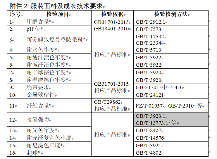 ②安全质量规范:包括但不限于纤维含量、甲醛含量、PH值、可分解致癌芳香胺染料、接缝强力、起球、耐皂洗色牢度、耐水色牢度、耐汗渍色牢度、耐摩擦色牢度、耐光色牢度、耐光汗复合色牢度等。