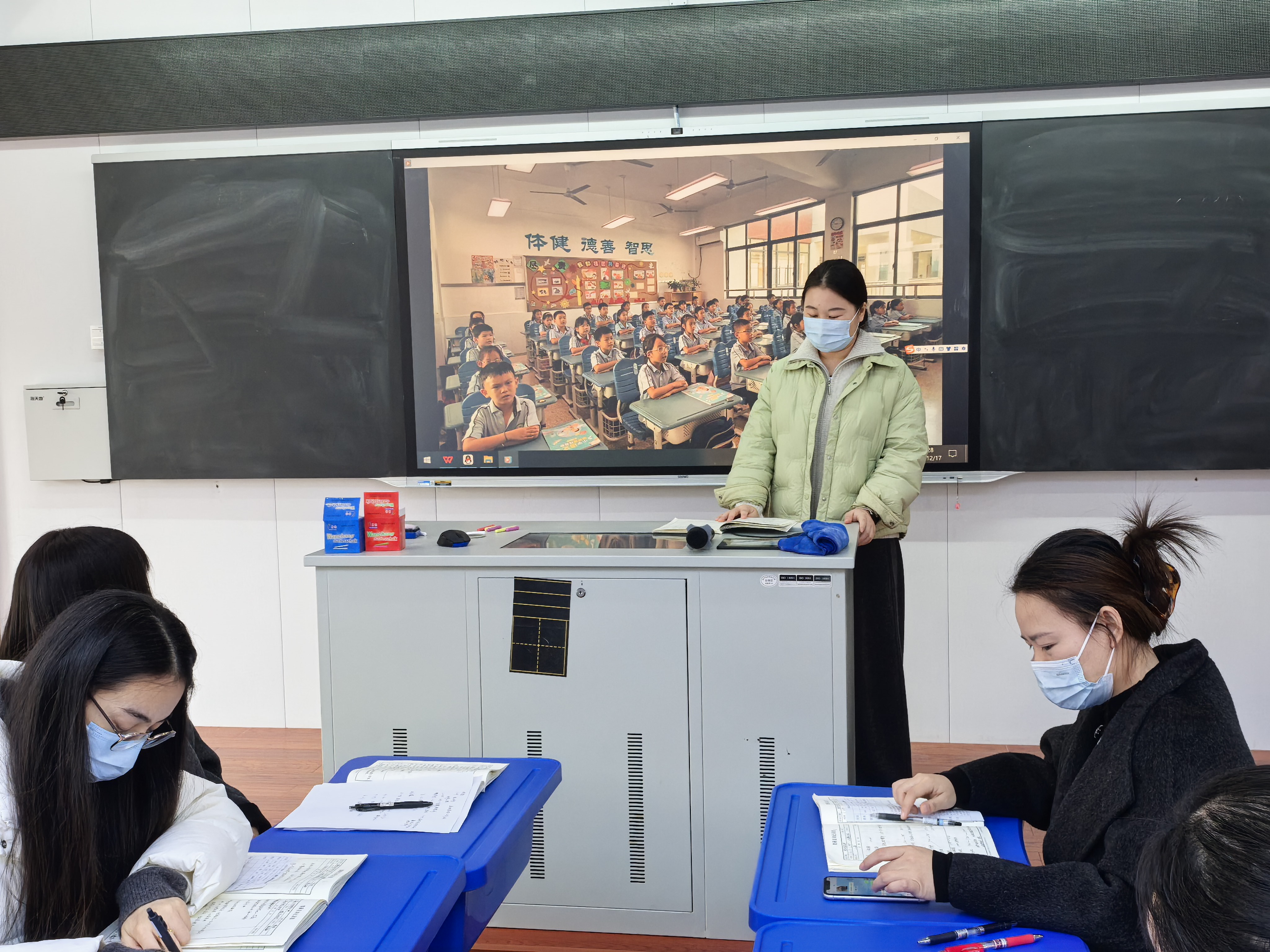 李瑶瑶老师就学生的课前准备,表扬全对学生,学生书写规范进行点评。