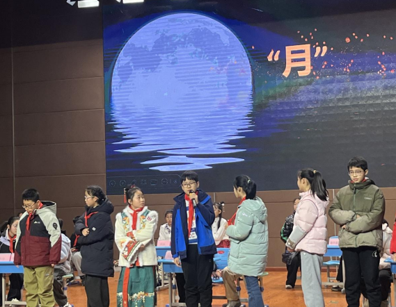本次比赛设置上下句衔接、团队辨析、综合抢答、飞花令四大环节,题型从基础的诗句衔接延伸至深度的诗词辨析,全方位考察学生的诗词积累与理解能力。团队辨析环节中,题目设计巧思十足:从《关雎》“窈窕淑女,君子好逑”的字形辨析题,到《敕勒歌》“穹庐”词义的判断题,从杨万里《小池》《晓出净慈寺送林子方》的诗句排序题,再到《十五从军征》“十五从军征,八十始得归”的名句填空题,各战队成员围坐讨论、分工协作;而《水调歌头》“但愿人长久,千里共婵娟”情感主旨的判断题,也让选手们在思辨中加深了对诗词内涵的理解。飞花令环节更是将活动推向高潮,9名选手围绕关键字“月”轮番吟诵,妙语连珠,赢得现场阵阵喝彩。
